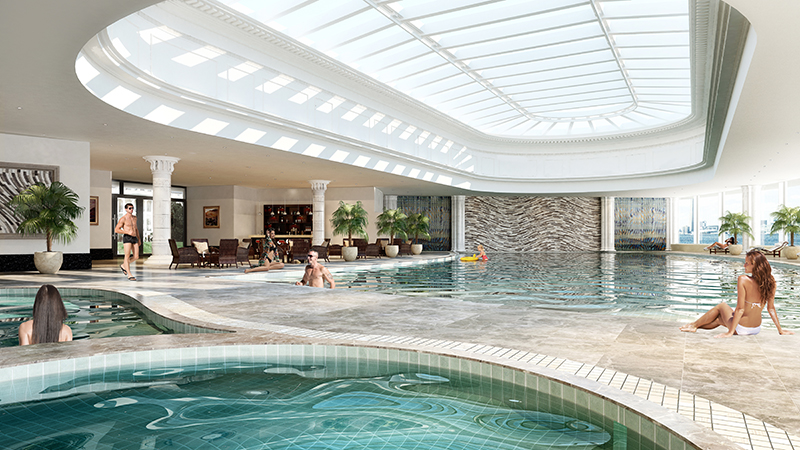 • Bể bơi trong và ngoài trời rộng 350m